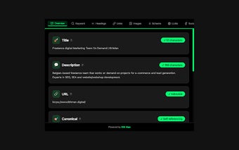 6th Man SEO 확장은 Chrome 브라우저 내에서 직접 SEO 분석을 위해 설계된 강력한 도구입니다. 이 확장은 사용자에게 메타 태그, 제목, 링크, 이미지, 키워드 및 구조화된 데이터 등 모든 웹페이지의 다양한 SEO 구성 요소에 대한 자세한 통찰력을 제공합니다. 주요 기능으로는 빠른 SEO 건강 점검, 키워드 밀도 분석 및 이미지 SEO 최적화가 포함되어 있으며, 모두 웹페이지의 가시성과 검색 엔진 순위에서의 성능 향상을 목표로 합니다. 사용자는 또한 풍부한 결과를 위한 구조화된 데이터 구현을 분석하고 소셜 미디어 미리보기가 최적화되었는지 확인할 수 있습니다.